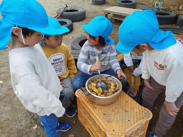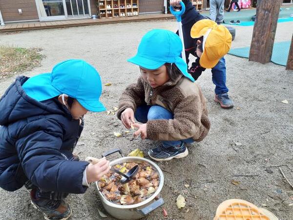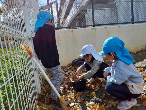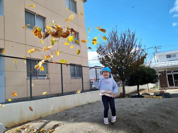 落ち葉の季節 落ち葉の季節になりました。風が吹くと飛んでいく落ち葉を見てもっと飛ばしてみたくなってようでした。落ち葉と一緒に落ちていたかりんの実はとってもいい匂い。さっそくごちそう作りが始まりました。 たくさんの落ち葉みーつけた 風と一緒に飛んでいけー もっと飛ばそう! わたしもやってみたい かりんのごちそう いいにおいするね 2025/11/25